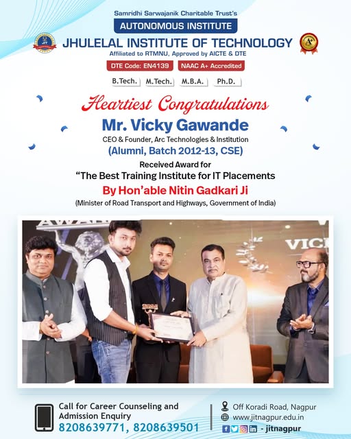 CEO & Founder, Arc Technologies & Institution, (Alumni, CSE Batch 2012-13), for receiving the prestigious award: “The Best Training Institute for IT Placements”๐ At the hands of Honโble Shri Nitin Gadkari โ Minister of Road Transport & Highways, Govt. of India.