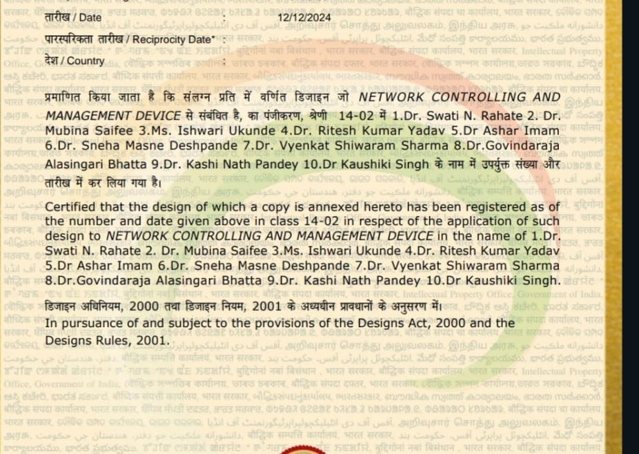 Department of Business Administration is glad to share that we have registered a design patent 🥇 on NETWORK CONTROLLING AND MANAGEMENT DEVICE in the name of 1. Dr. Swati Rahate, Dr. Mubina Saifee and Ms. Ishwari Ukunde from Indian Patent Office. 💡Design No. : 440429-001