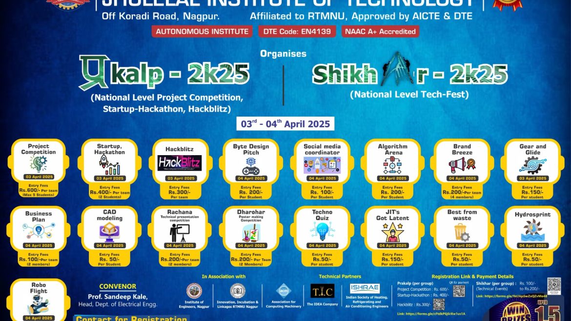 We are thrilled to invite you to Prakalp – National Level Project Competition, Startup-Hackathon, Hackblitz & Shikhar – National Level Tech Fest in association with Institute of Engineers, Nagpur and Innovation, Incubation & Linkages, RTMNU Nagpur happening on 3rd-4th April 2025 at Jhulelal Institute of Technology, Nagpur. 🚀💡