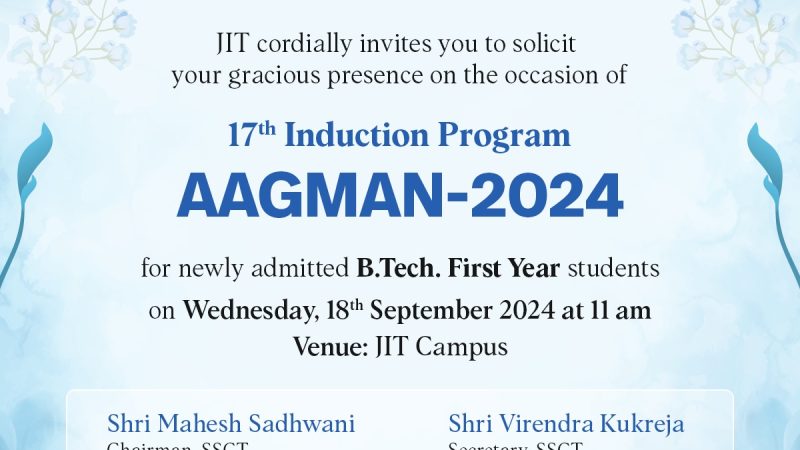 AAGMAN 2024 https://www.jitnagpur.edu.in/wp-content/uploads/2024/09/Aagman-819x1024.jpg 819 1024 bhawnani https://secure.gravatar.com/avatar/3b17af021e602303f145caf37431fd22c0cfec8f5638bb21fcf50438bc18322e?s=96&d=mm&r=gWe are organising an Induction Program for newly admitted B. Tech. First Year students- AAGMAN-2024 on Wednesday, 18th September, 2024 from 11 AM onwards. Mr. Sunil Narware, Global Head-Administration, Infocepts Technologies has kindly consented to be the Chief-Guest for AAGMAN-2024.Venue- JIT Campus