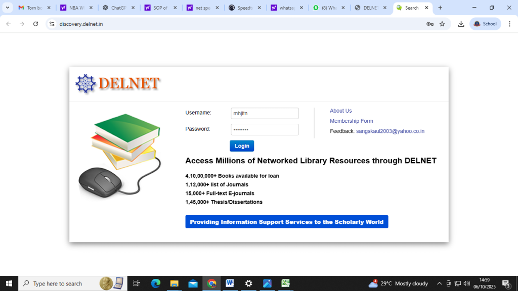 JIT Library is a member of Developing Library Network (DELNET) which provides services like browsing of Union Catalogue.Inter Library loan and Document Delivery Services Interested reader can access the catalogues of other libraries through DELNET and request the required books/documents to be procured from these libraries on loan for a limited period.